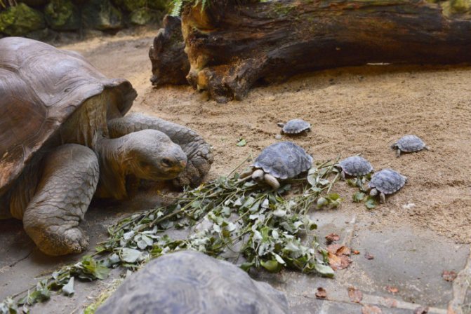 - Сухопутные. Это наземные животные, среди которых встречаются как мелкие разновидности, так и гигантские виды, например, обитатели Галапагосских островов. Вес отдельных особей-гигантов может достигать 400 кг. В большинстве своём наземные черепахи — это животные с высоким панцирем и столбовидными ногами, покрытыми чешуйками и щитками. Продолжительность жизни у них может достигать 100, а у отдельных экземпляров и 150 лет. Сухопутные особи передвигаются медленно, а в случае опасности скрываются в своём панцире.