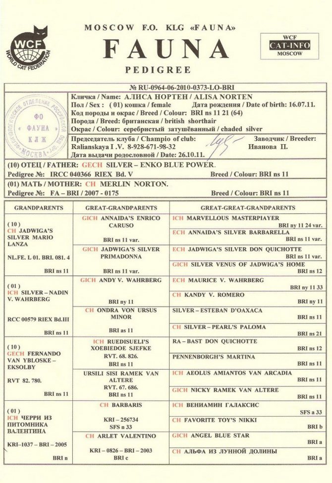- Эмблема и название клуба, выдающего родословную, телефон, печать, ФИО и подпись председателя клуба;