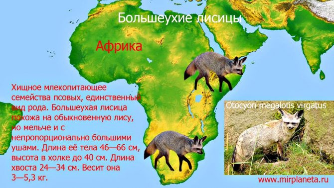 Большеухая лисица распространена в двух районах Африки, там, где обитают травоядные термиты. Она населяет полупустыни и сухие саванны. Зимой она ведет дневной образ жизни, а летом ночной. Наличие 48 зубов является главной отличительной особенностью этого вида. Растительную пищу почти не ест, на домашних животных не нападает. Уши, которые помогают в жару охлаждать организм и хорошо слышать передвижение добычи, имеют длину 13 см. Она имеет только один подвид — Otocyon megalotis virgatus. Лисицы моногамны. Раз в год самка рожает от 2-6 щенков, но так как сосков у неё только четыре, то слабых лисят она убивает. Угрозой для лисы являются местные жители, которые убивают её ради меха и мяса.