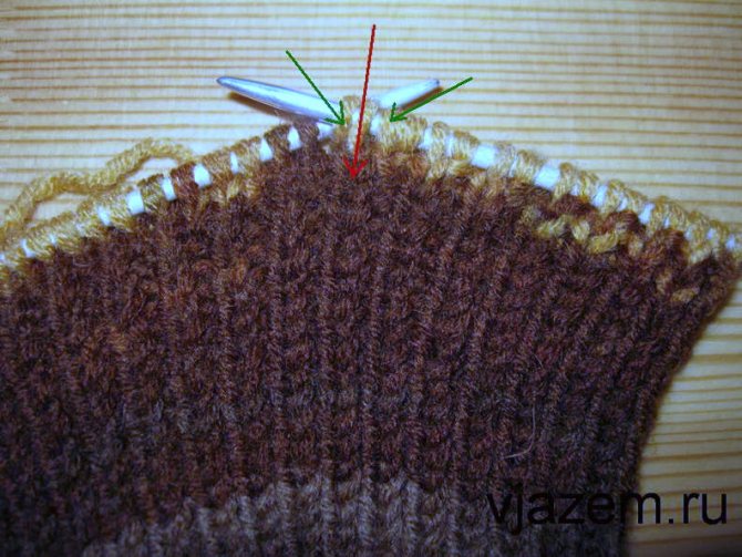 Петли прибавляются следующим образом: петли резинки 1 х 1, прибавить 1 петлю, 1 лицевая петля, прибавить 1 петлю, петли лицевой глади, перед последней петлей лицевой глади прибавить 1 петлю, 1 лицевая, прибавить 1 петлю, петли резинки. Прибавляемые петли со стороны лицевой глади вяжутся также лицевой гладью, а прибавляемые со стороны резинки — включаются в узор резинки.