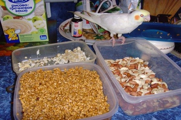 Кроме перечисленных продуктов в рацион птицы следует включить пророщенное зерно. Для этого обычное зерно тщательно промывается и заливается водой комнатной температуры часов на пять. Затем вода сливается, зерно промывается повторно и заливается водой той же температуры, но уже часов на 8-9. За это время зерно должно проклюнуться. Перед кормлением проростки следует подсушить, так как не все попугаи не любят мокрую пищу.