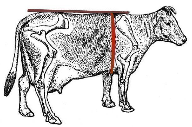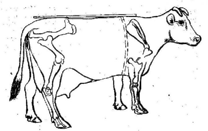 При измерении окружности грудины скота (ОГ) сантиметровая ленточка должна находиться на отдалении ширины человеческой ладошки от локтевого сустава. Другую величину — длину тела (ДТ) — меряют по косой линии, причем от переднего выступа сустава плеча (внизу шеи) и до бугра седалища (около хвоста). Все промеры снимают в сантиметрах.