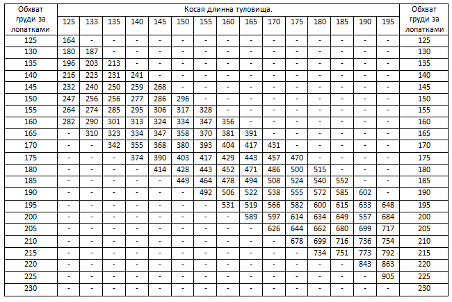 Если показатели косой длины и обхвата за лопатками оказались равными 100 см, на пересечении горизонталей и вертикалей находим число 87.