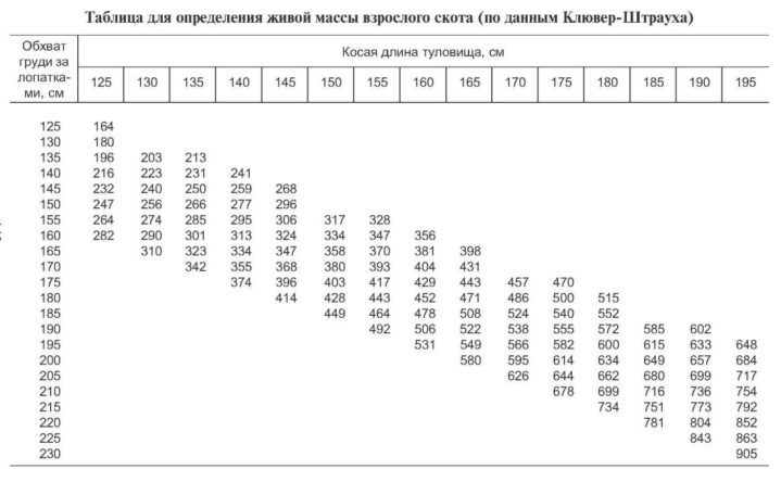 Оказывается, возможно даже без взвешивания подсчитать массу (приблизительную величину) крупного рогатого скота, причем благодаря известнейшей среди зоотехников разработке Клювера-Штрауха и им составленной таблице. Под рукой желательно иметь мерную (сантиметровую) ленту или обыкновенную строительную рулетку. Любым этим измерителем меряют обхват грудной клетки (ОГ), а также боковую длину тела (ДТ), но по косой линии. Такой метод походит для подросших телят и взрослых (после 12 месяцев) быков или самок. Для молодых животных (моложе года) используют таблицу другого зоотехника — Фройвена.