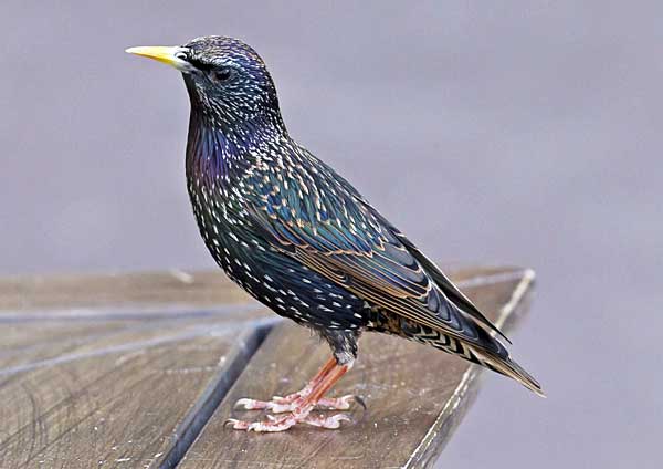 В зависимости от разновидности окрас пернатого бывает слегка зеленоватым, фиолетовым, бронзовым или синим. Перед весной, во время линьки, на перышках проступают белые и бежевые вкрапления, больше всего на груди и крыльях.