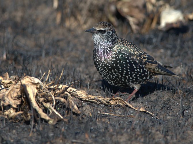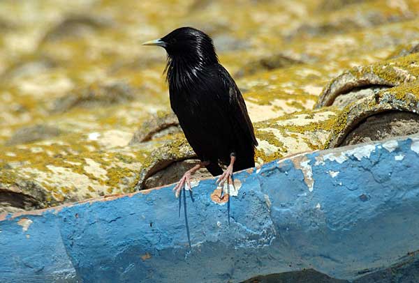 Черного скворца редко встретишь, он в половину меньше дрозда, оперение в целом похоже, но на горле по весне отрастают длинные перышки. В холодное время года на голове появляются белые крапинки. Клюв желтый только во время брачного периода, в остальные сезоны – темно-бурый.