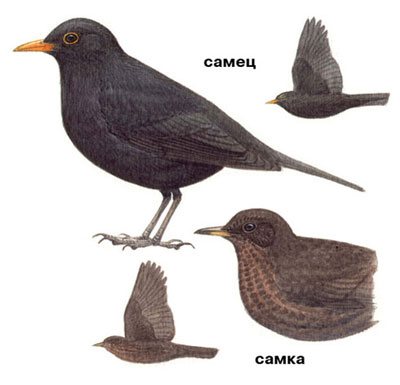 Больше всего между собой похожи черный дрозд и черный скворец. Первый заселяет леса, овраги, сады и парки по всей Европе, а также России, и леса на склонах кавказских гор. Из всего семейства дроздовых черный – самый крупный представитель. Его оперение черное, блестящее, глянцевое, клюв, ноги и круги вокруг глаз ярко желтые. Самка дрозда коричневая с темным хвостом и светлой грудкой.