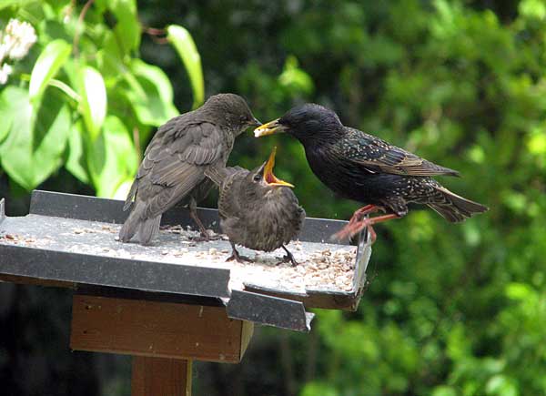 - Воспитанием потомства: у скворца яйца высиживает самка, изредка ее подменяет самец. Через – 11-13 дней вылупляются птенчики, которые в течение двух недель кормятся от обоих родителей по 10 раз в день. Дрозды кормят своих птенцов по 200 раз в день, занимаются этим также оба родителя. Интересно, что к моменту становления самостоятельными, половина выводка погибает.