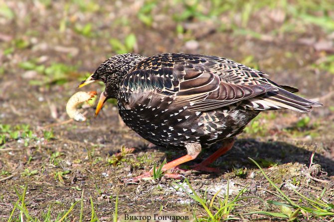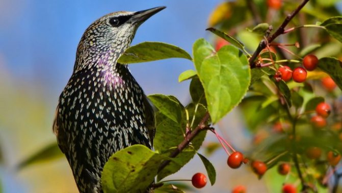 - Питанием: дрозд по лету – настоящая напасть для дачника, он съедает все посевы, портит фрукты и ягоды. Скворцы любят насекомых, своим твердым клювом они способны раздолбить панцири жуков, которые портят сельскохозяйственные угодья.