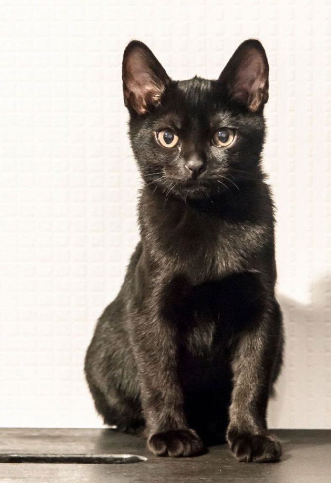 - Шерсть бомбейской кошки – это ее достояние и визитная карточка. Первое, что бросается в глаза при виде бомбейской кошки, блестящий с отливом угольно-черный окрас шерсти. Иногда даже кажется, что хозяева специально нанесли на кошку специальные средства для усиления блеска и лоска. Стандарты определяют цвет ровный без малейших вкраплений, подпалин другого оттенка.Шерсть по длине короткая, плотная, без подшерстка. Каждая шерстинка идеально выкрашена в черный цвет по всей длине. Котята же могут иметь пятнышки на теле, но при оценке экстерьера будут проигрывать идеально черным котятам. К тому же шерсть у малышей очень мягкая и легкая, слегка удлиненная. Но к году после линьки все стандарты восстанавливаются.