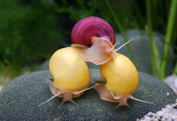- Ампулярия. Неприхотливая аквариумная улитка родом из Южной Америки. В благоприятных условиях может вырастать до 10 см в длину.