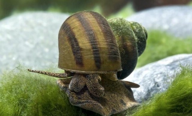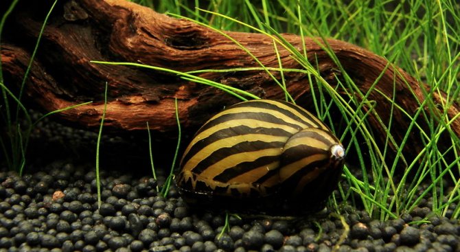 - Неретина. Родиной моллюска является Африканский континент. Раковина вырастает до 3-4 см в диаметре и имеет несколько вариантов окраса: тигровый, оливковый, полосатый. Это распространенные домашние улитки, которые становятся настоящим декоративным украшением аквариума.