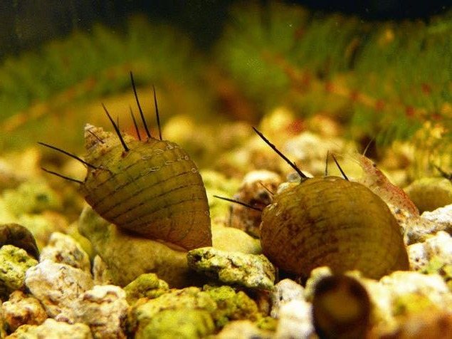 - Тиара. Аквариумный моллюск, на панцире которого вырастают небольшие похожие на иглы волоски. Волосатая улитка достигает длины 2-3 см и имеет желтый или кремовый окрас.
