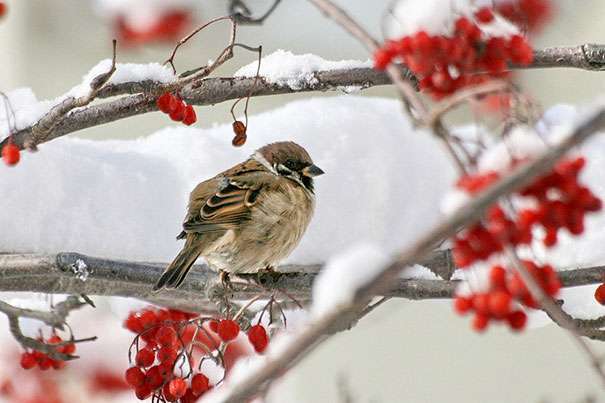 В холодное время года птицам приходится туго. Снег покрывает поля, насекомые прячутся на зиму, растительной пищи практически нет. Воробьи – птицы пугливые, но голод заставляет их становиться попрошайками. Что едят воробьи зимой? Их рацион довольно скуден. Без помощи человека маленьким птичкам не справиться. Если им повезет, они могут полакомиться зимними ягодами и сохранившимися семенами. С удовольствием пернатые поглощают пшено, подсолнечные семечки, высушенные ягоды. С не меньшим удовольствием они склюют кусочек сыра или вареной колбасы. Готовую кашу, оставшуюся от завтрака, также можно предложить воробьям.